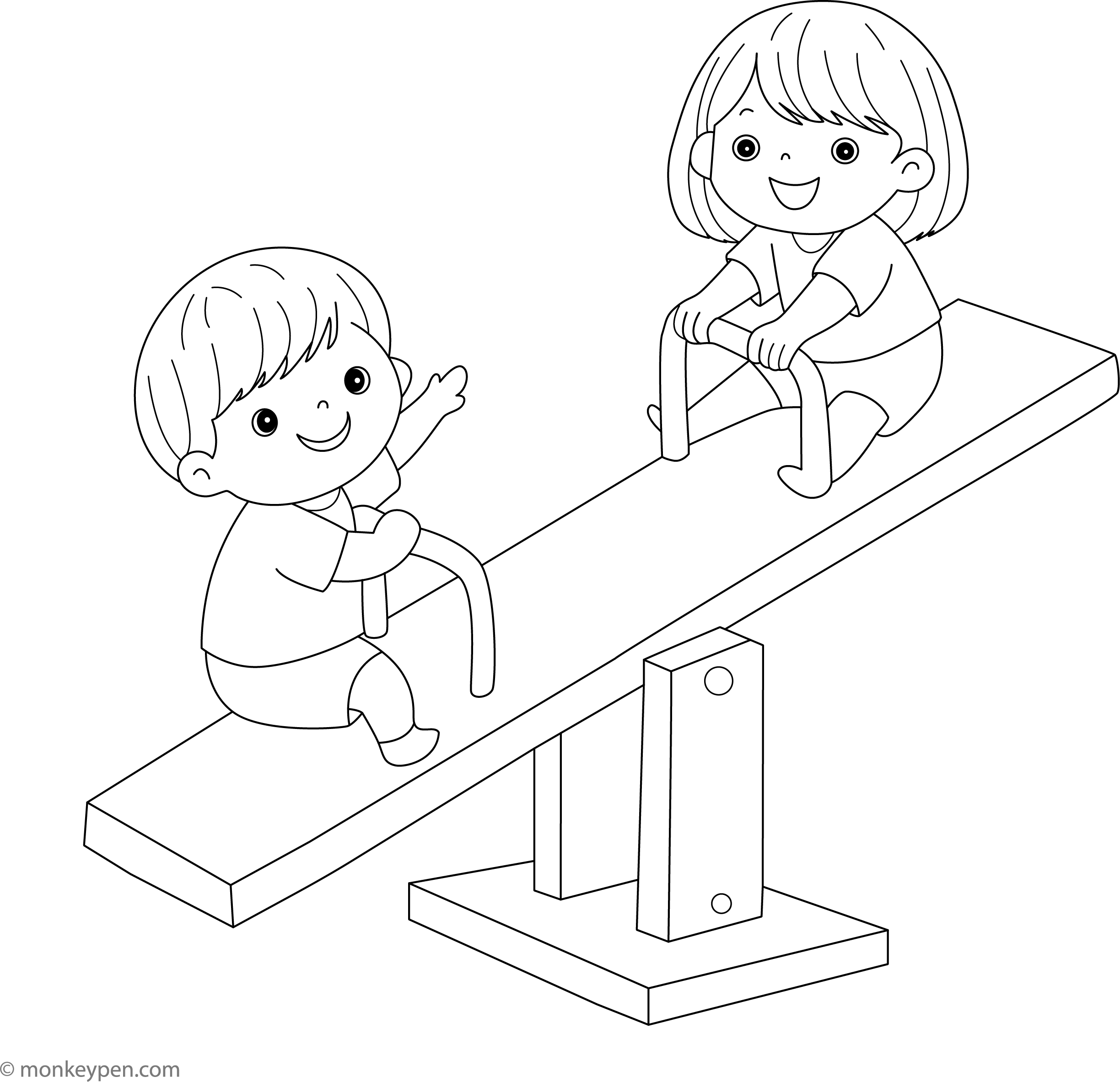 This coloring page depicts a playful seesaw located within a playground environment, with two children positioned on opposite ends. The scene includes elements such as grass, trees, and clouds in the sky to create a lively outdoor atmosphere. Children can personalise the coloring by selecting various hues for the seats, handles, and clothing. This activity is designed to support children's understanding of balance and motion while fostering artistic expression. It serves as an engaging resource for teaching playground activities and enhancing fine motor skills through careful coloring.