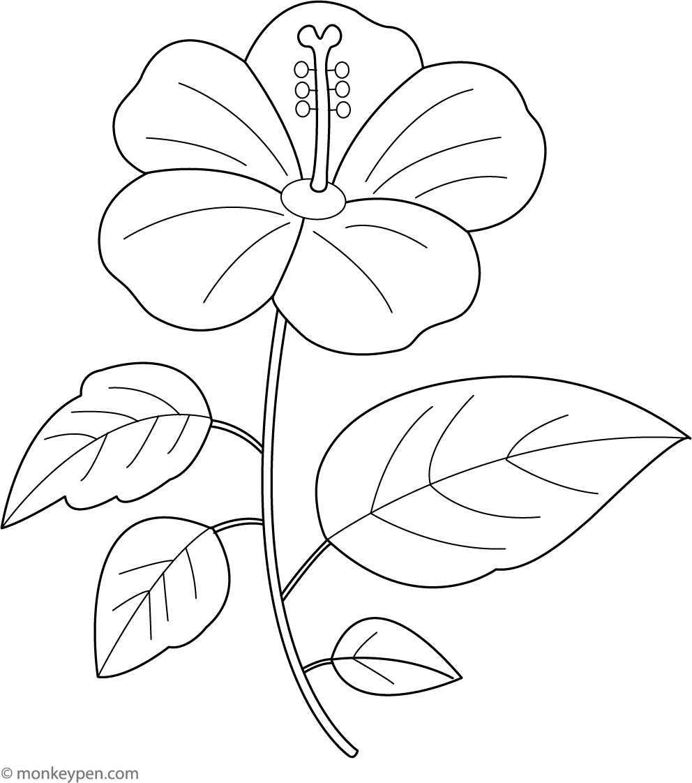 This page features one large hibiscus blossom with clean, open lines perfect for beginners. Children can focus on coloring the petals, stamen, and leaves without feeling overwhelmed.