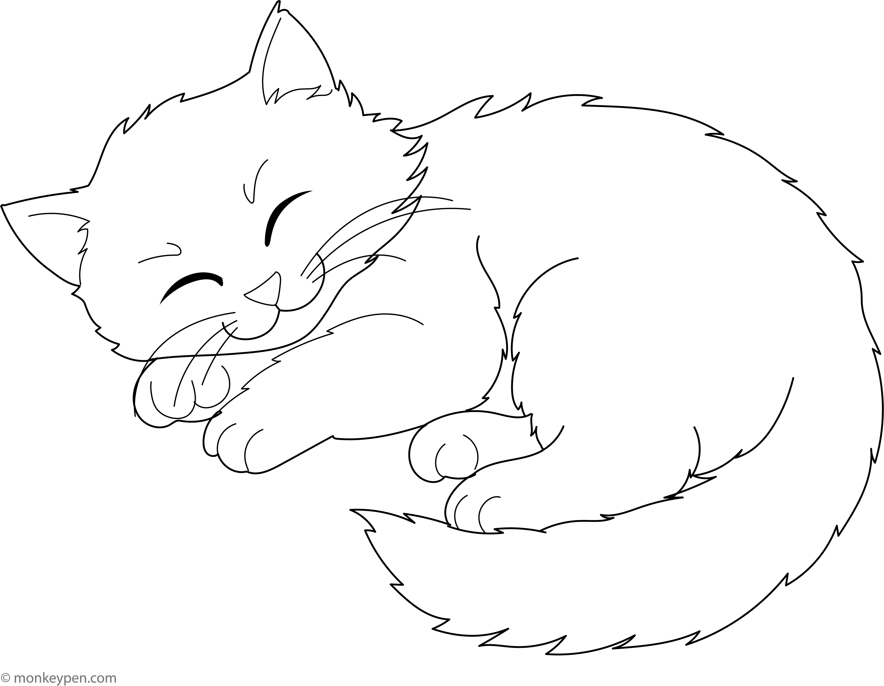 This soothing coloring page depicts a fluffy kitten curled up in peaceful slumber, its tiny face resting in contentment. Surrounded by cozy elements like a blanket, pillow, or soft toy, the gentle scene invites young artists to embrace quiet moments through creative expression. Children can color the kitten using soft greys, warm oranges, or creamy whites, and apply gentle pastels for the bedding and background. The calm atmosphere of the page encourages mindfulness and patience, making it a perfect choice for winding down or relaxing at home.