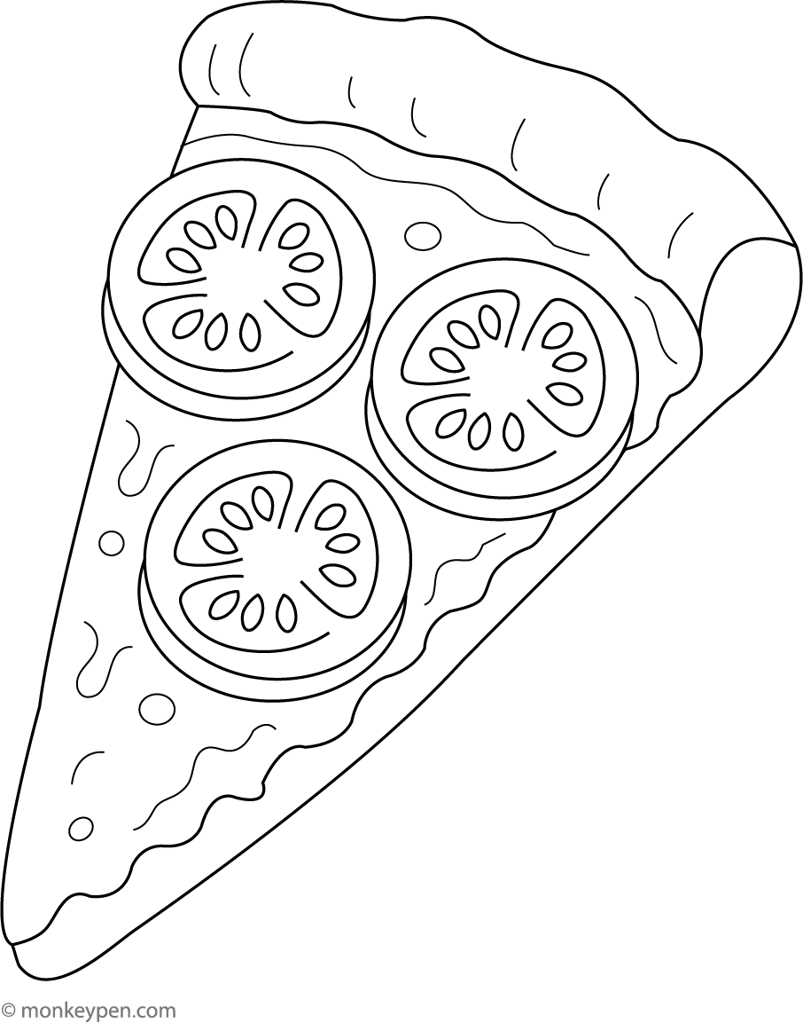 This colouring sheet showcases a slice of pizza garnished with fresh tomato slices, cheese, and herbs. Additional details such as plates, patterned tablecloths, or miniature vegetables enrich the scene with extra colouring opportunities.