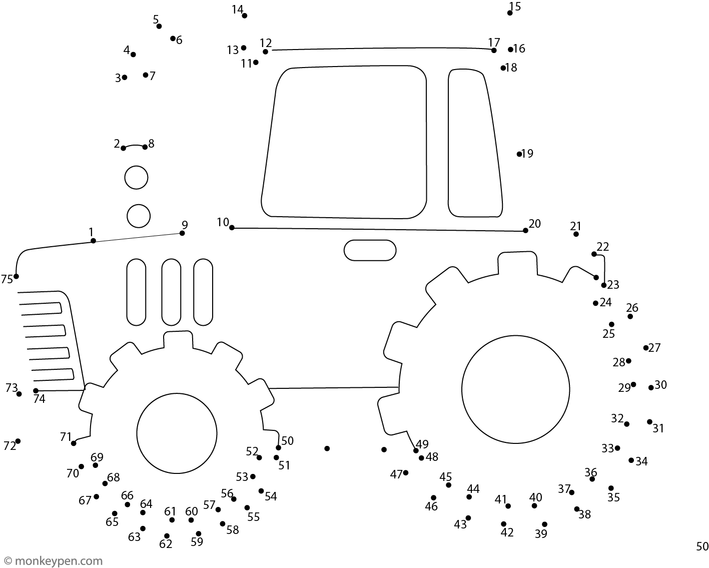 Children interested in farm machinery will enjoy this tractor dot-to-dot activity. By connecting the numbered dots, they will reveal a cartoon tractor with prominent wheels and a sturdy body. Kids can personalize the illustration with colors like green, red, or yellow. The activity promotes number sequencing, concentration, and fine motor control while introducing agricultural equipment themes. Its bold, simple design makes it engaging for young learners and fun for older children as well. Suitable for classroom lessons, farm-related projects, or creative play at home, this worksheet combines education with rural charm.