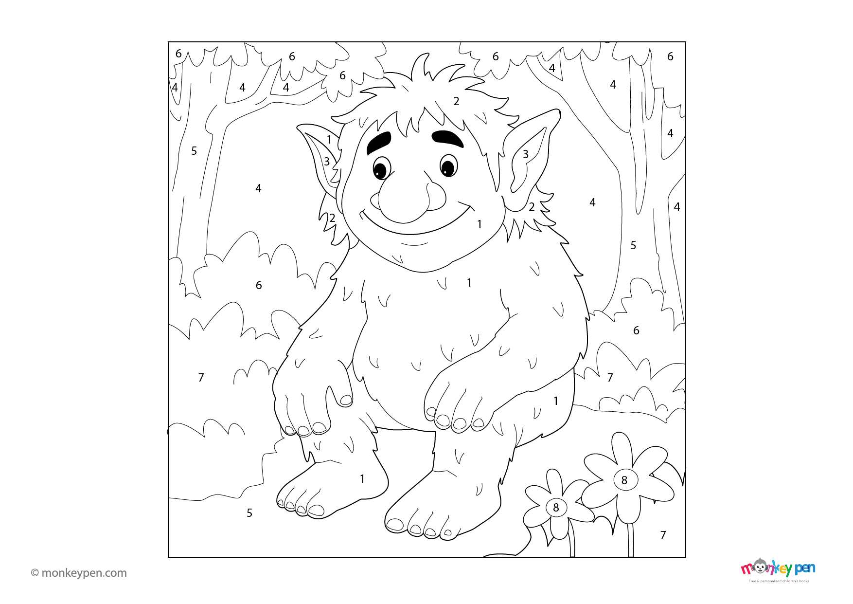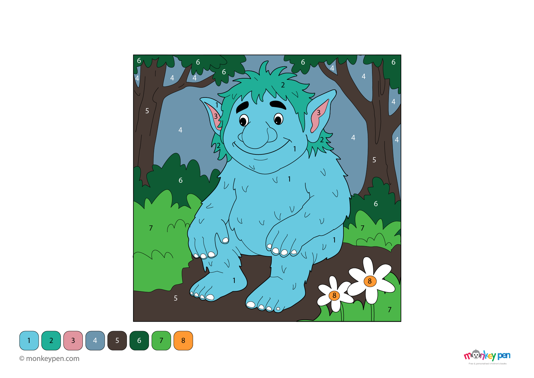 Enter a magical world with this troll in the forest color by number page. The illustration shows a friendly troll among trees, offering a playful and fantastical scene for children to color. Following the numbered guide, kids can bring the troll and surrounding forest to life with vibrant colors, supporting their number recognition and attention to detail.