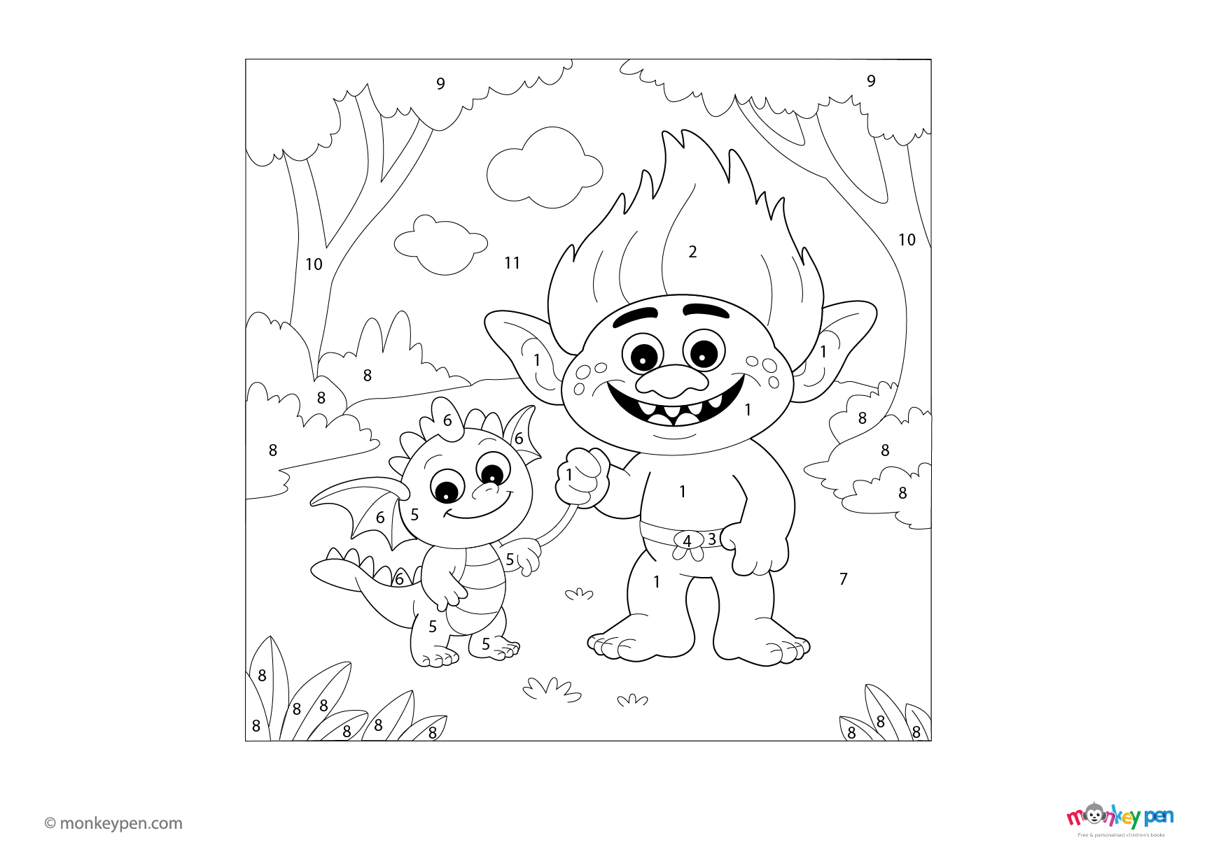 This fantasy-themed coloring page depicts a cheerful troll accompanied by its pet, offering an imaginative scene for children to explore. By following the numbered guide, young learners can fill in the illustration with vibrant colors, simultaneously enhancing their understanding of numbers, concentration, and creativity.