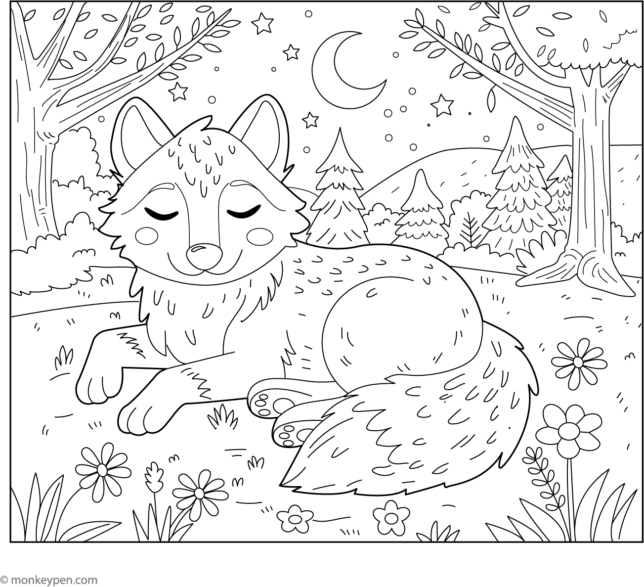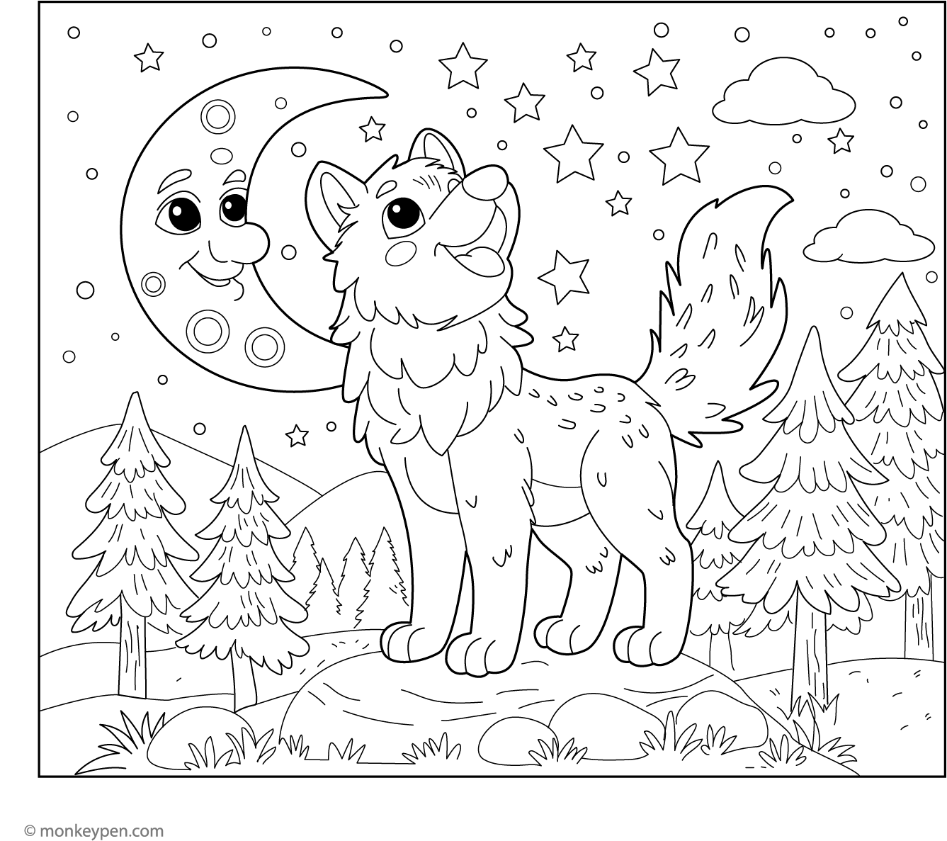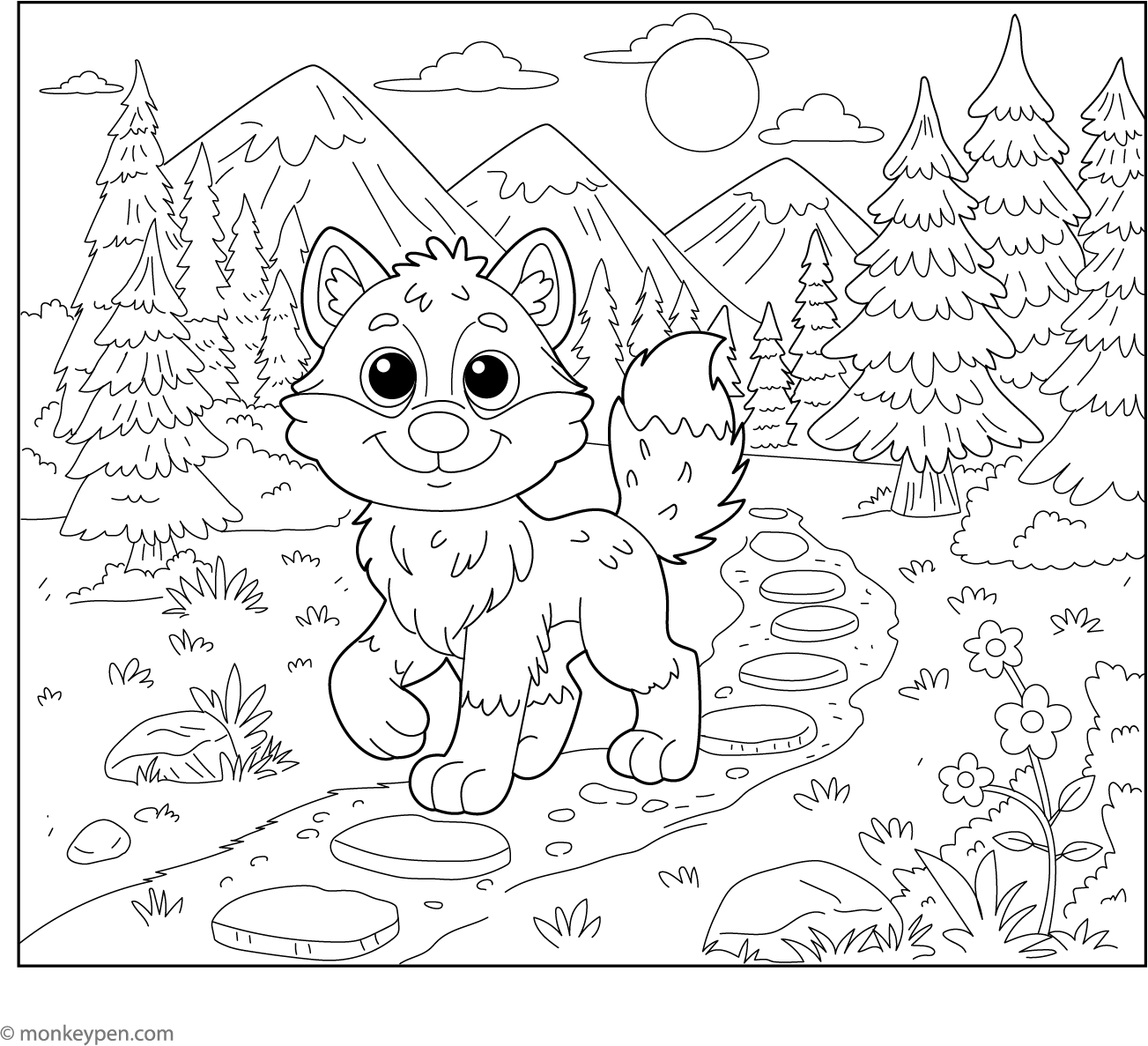 Meet the smart, powerful and fascinating animals through Monkey Pen’s printable wolf coloring book. Designed for little kids and curious minds, these printable wolf coloring pages feature wolfs in forests, mountains and snowy landscapes.