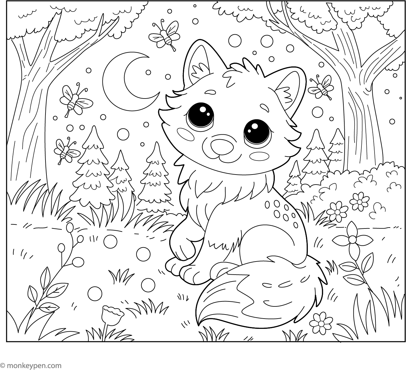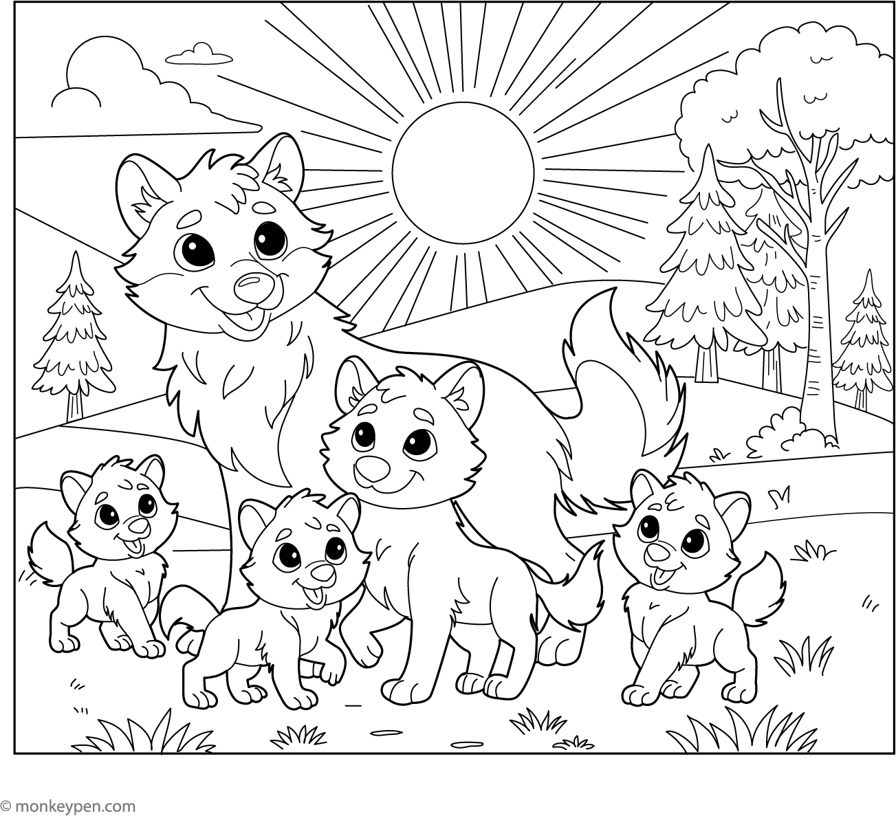 Start imagining the wild with wolf coloring pages for kids. In every page, see wolves and their cute cubs, making their own jungle adventures. Watch wolf resting under the night sky, families walking together, cubs playing in the winter forest and more.