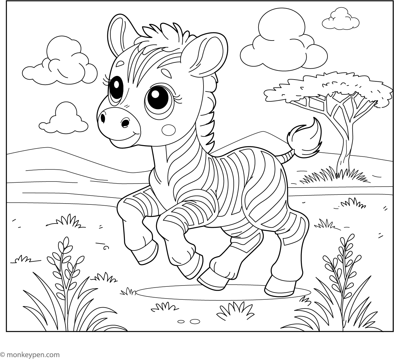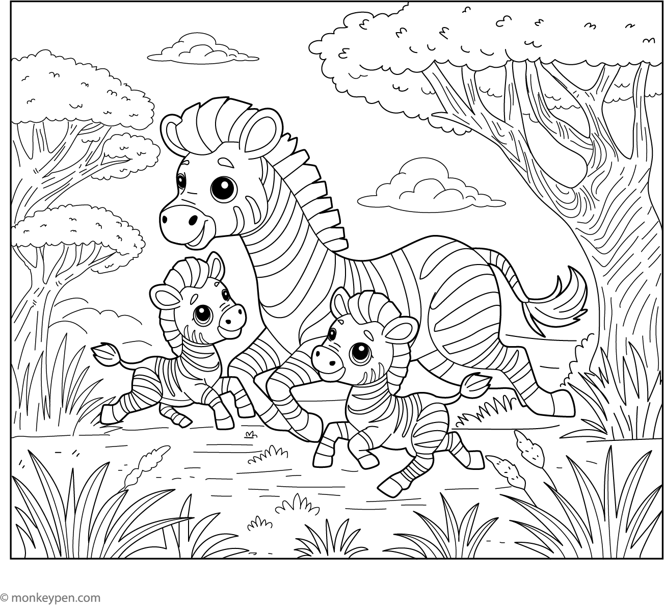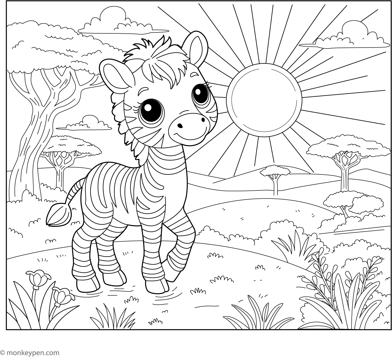 Journey to the savannah with this lively zebra coloring book for children. Each page illustrates zebras grazing, running in herds, or standing proudly against grassy plains. Kids can enjoy coloring bold black-and-white stripes, wide-open landscapes, and sunny skies.