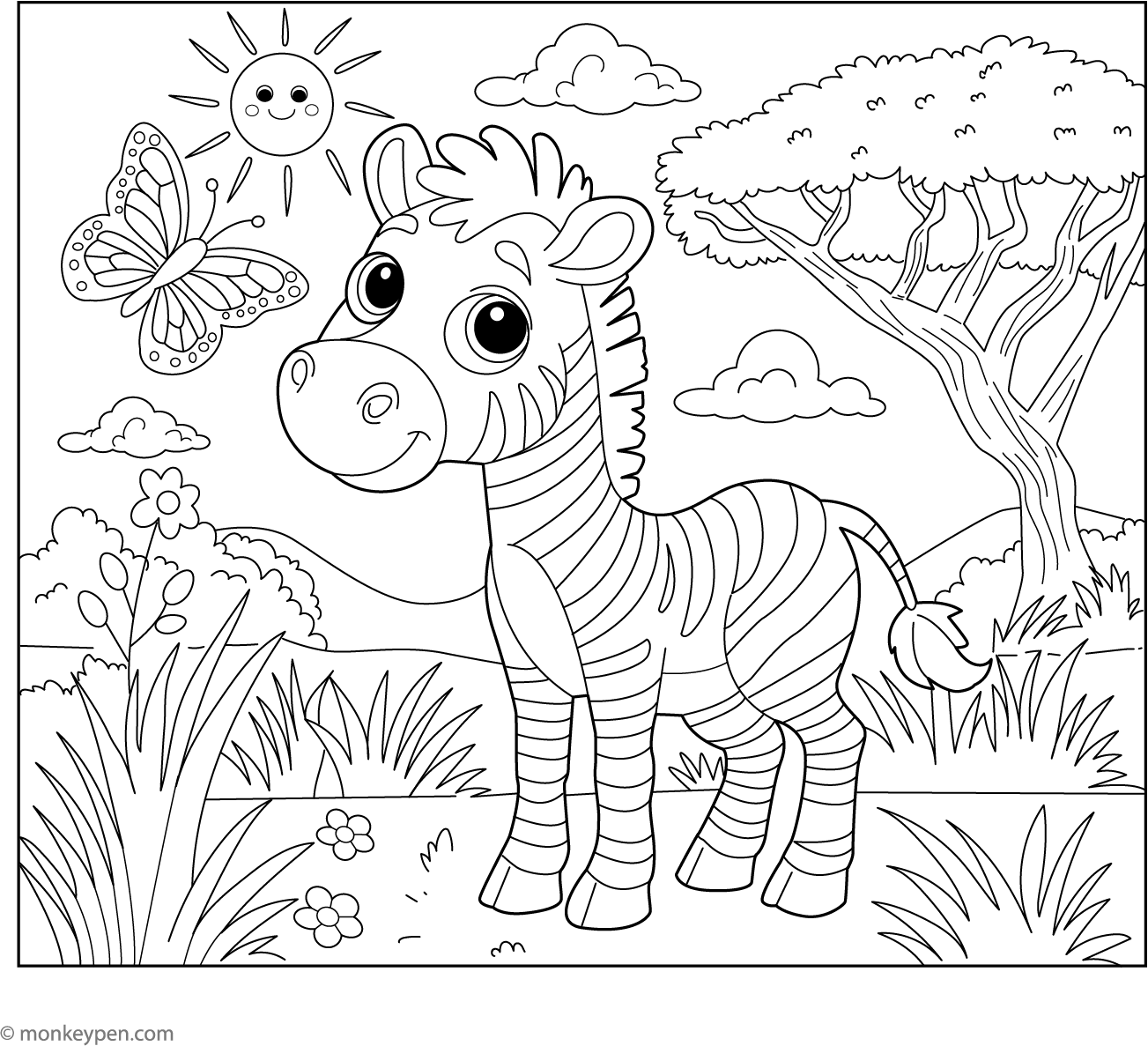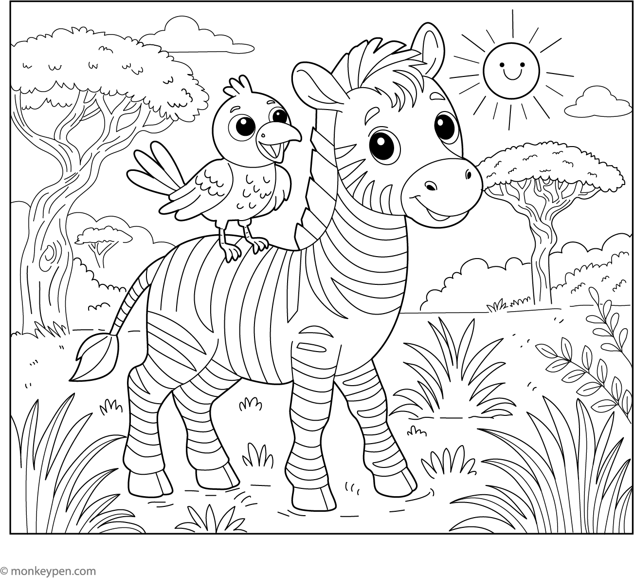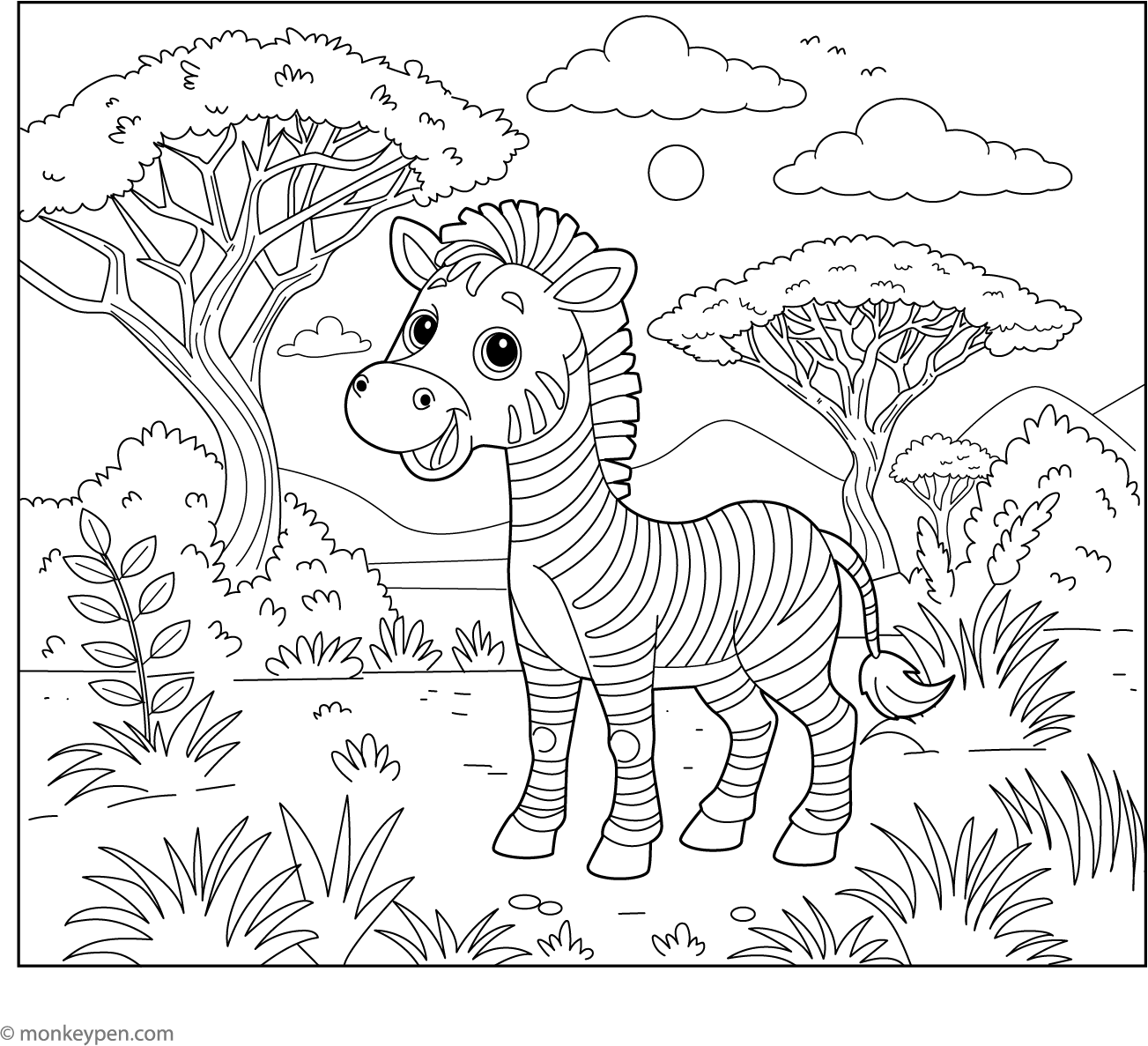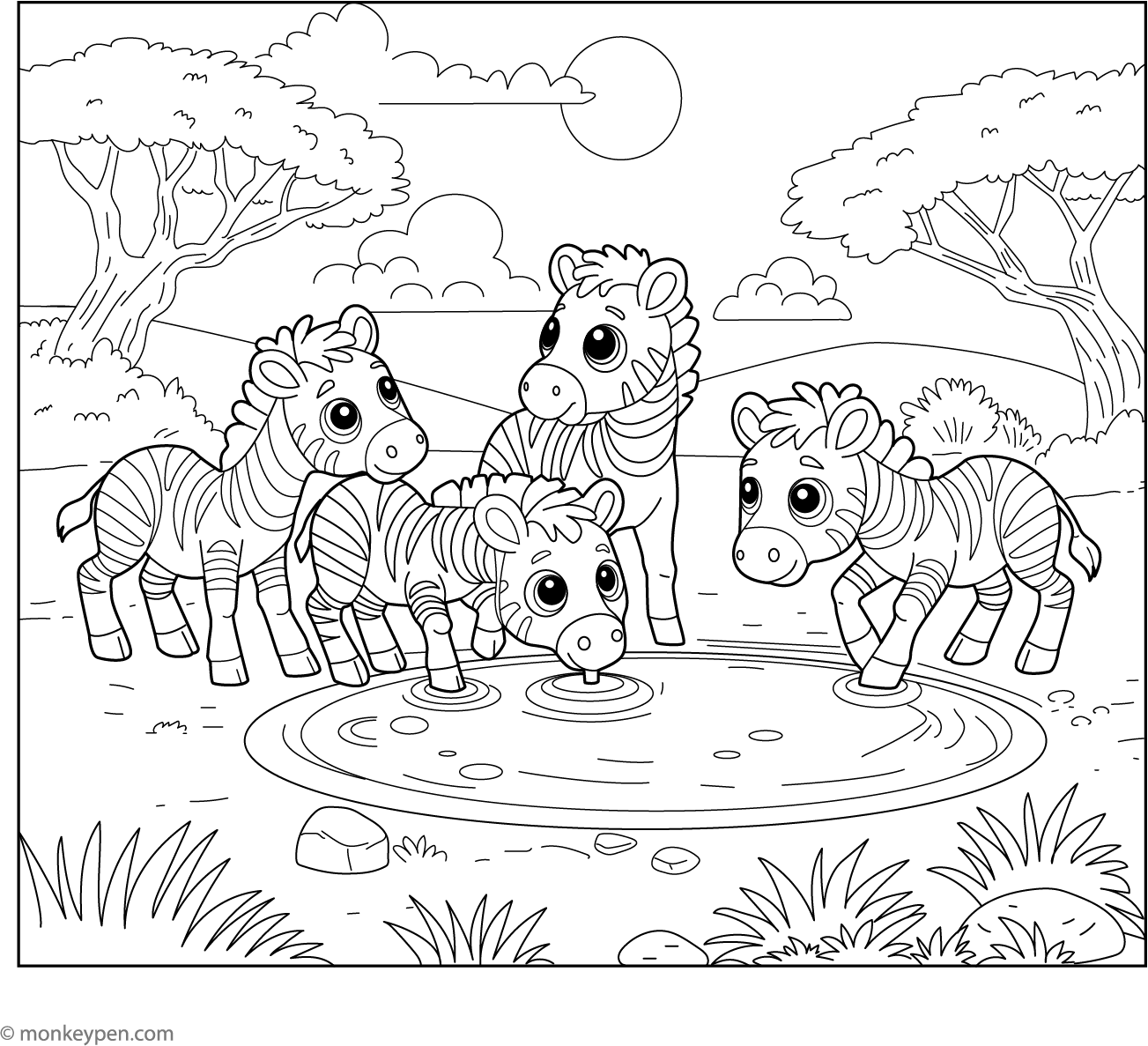 Journey to the savannah with this lively zebra coloring book for children. Each page illustrates zebras grazing, running in herds, or standing proudly against grassy plains. Kids can enjoy coloring bold black-and-white stripes, wide-open landscapes, and sunny skies.
